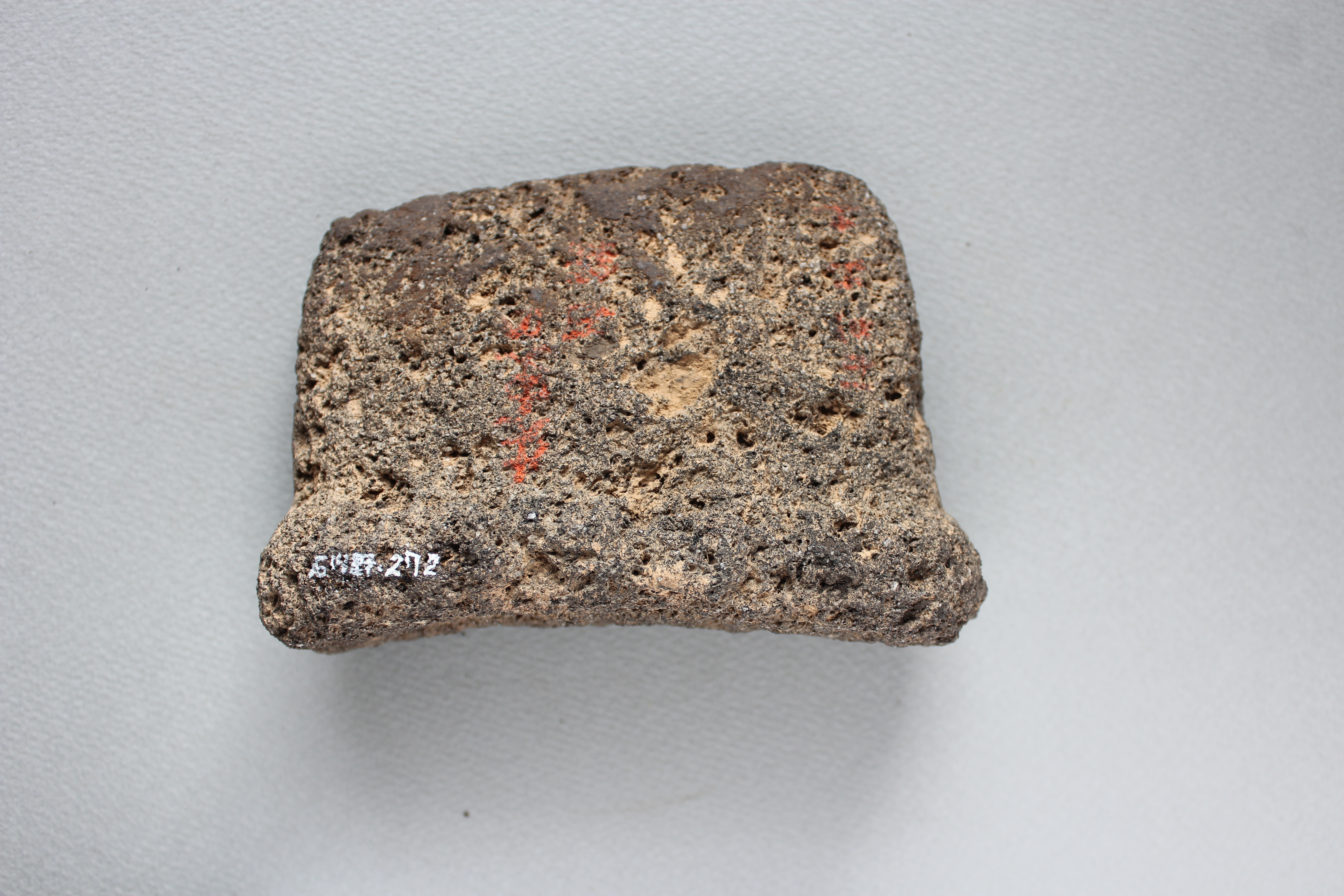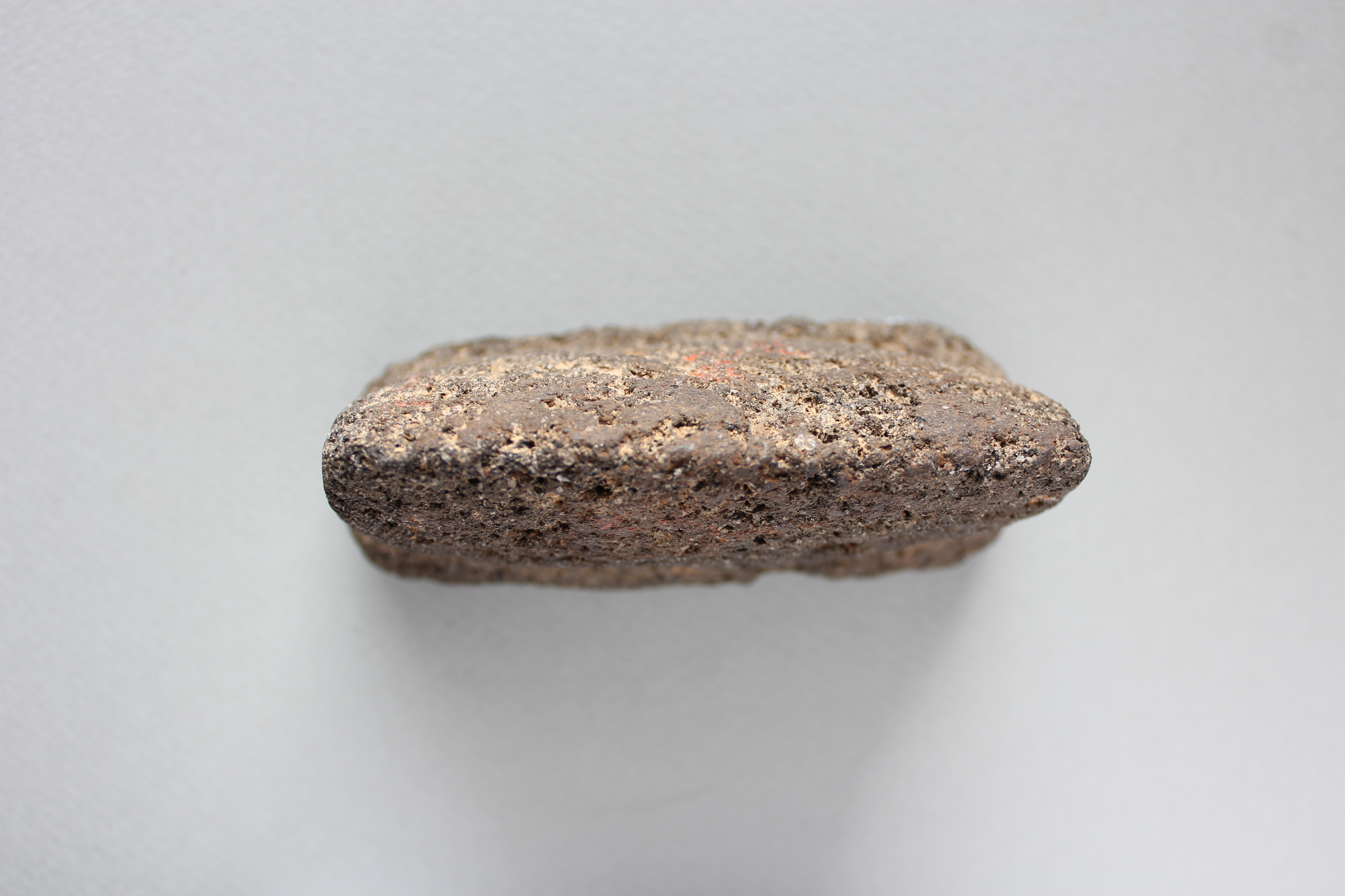 溶岩製。底面が広く球面状に凹む。頂部は板状で断面は凸形となる。