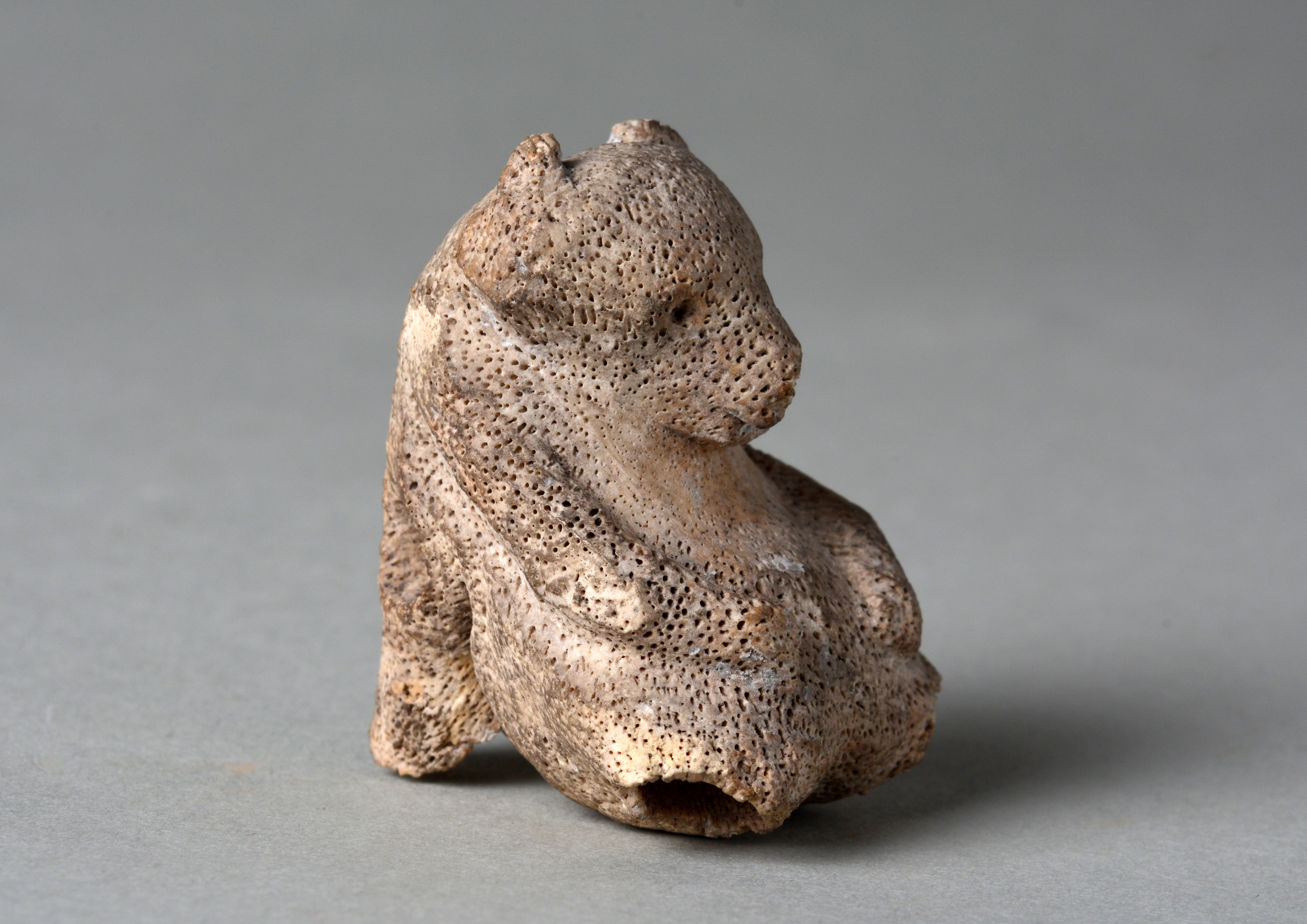 モウカザメの吻端骨製。クマ座像。下部有孔(3か所)