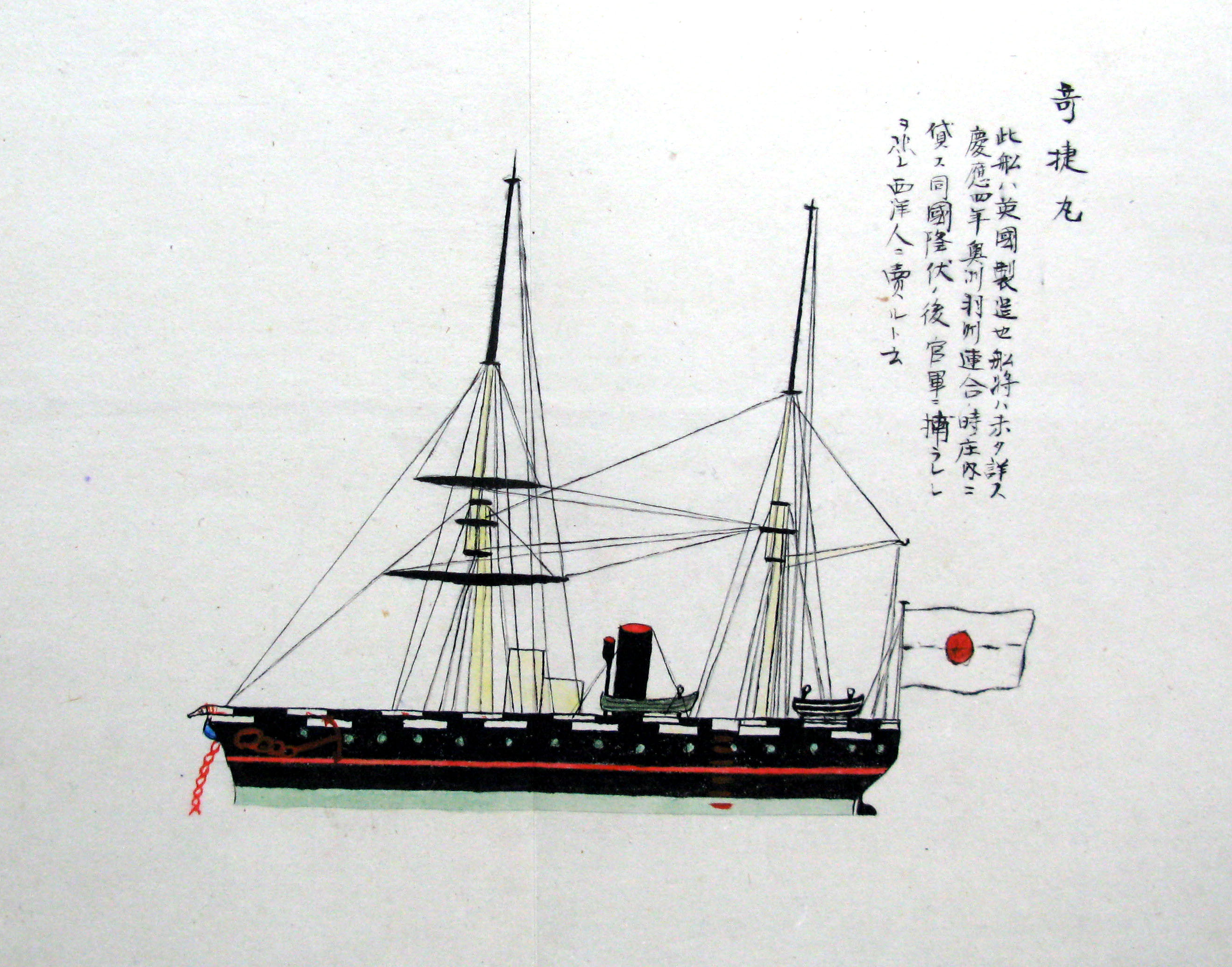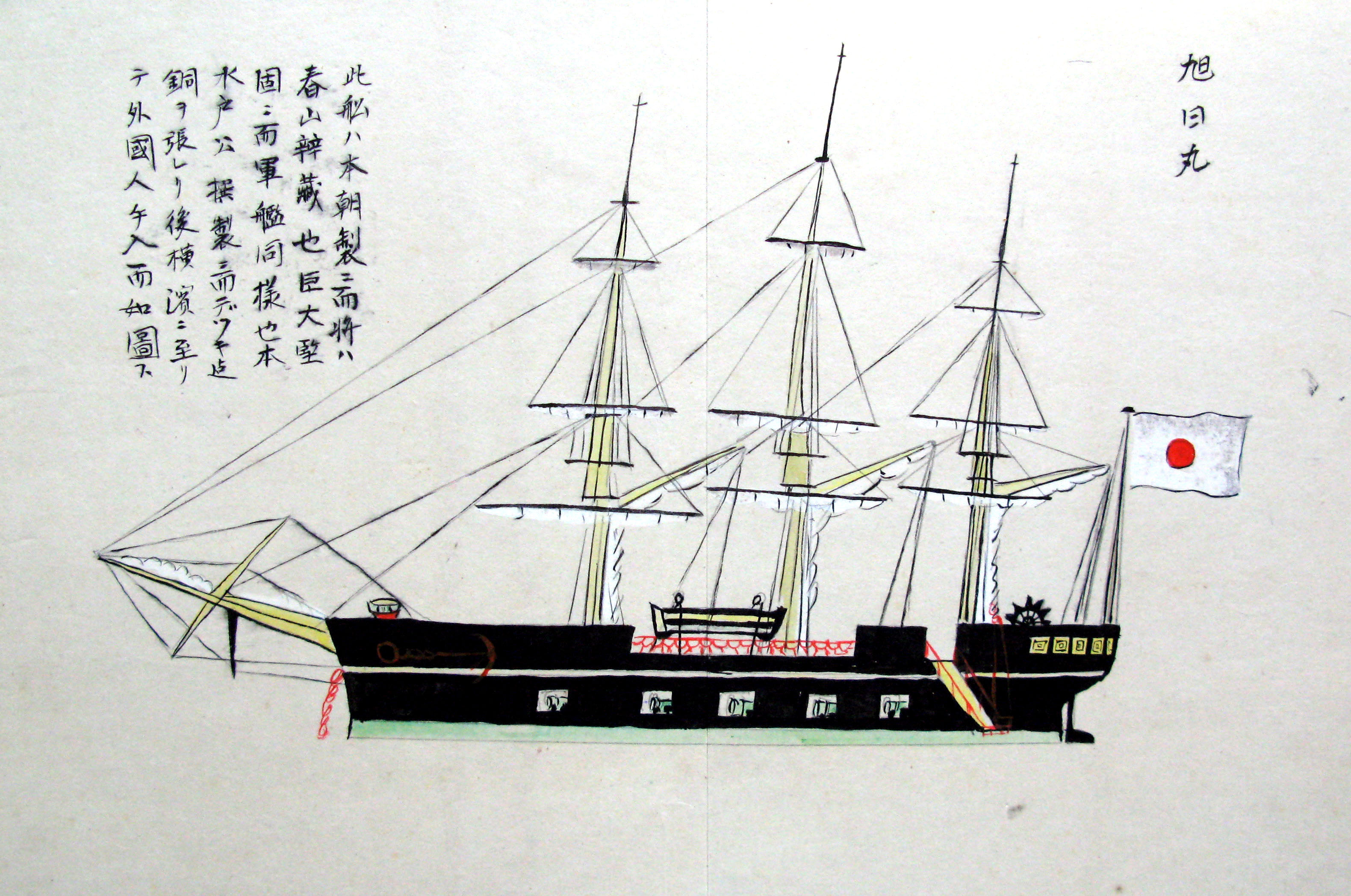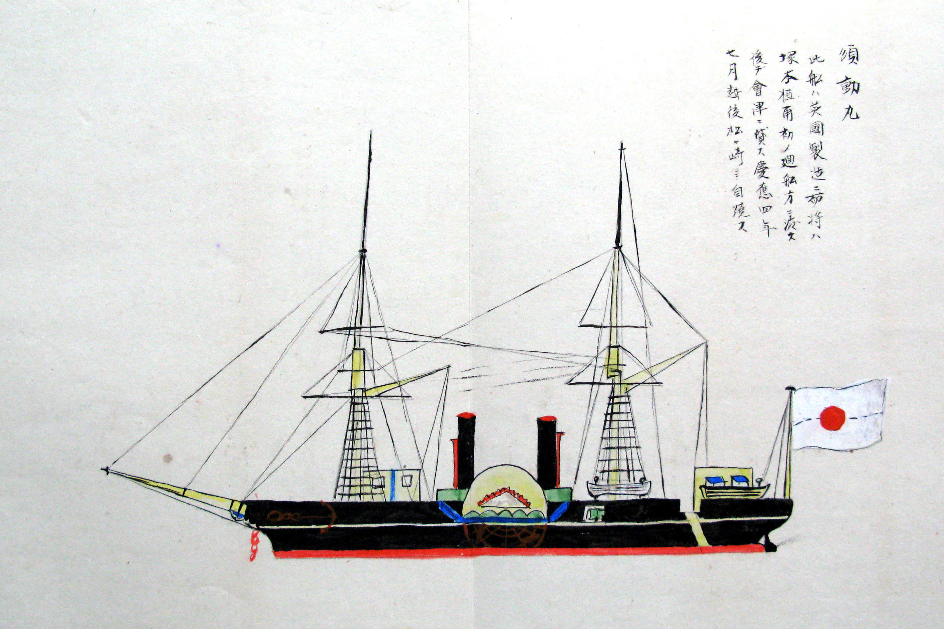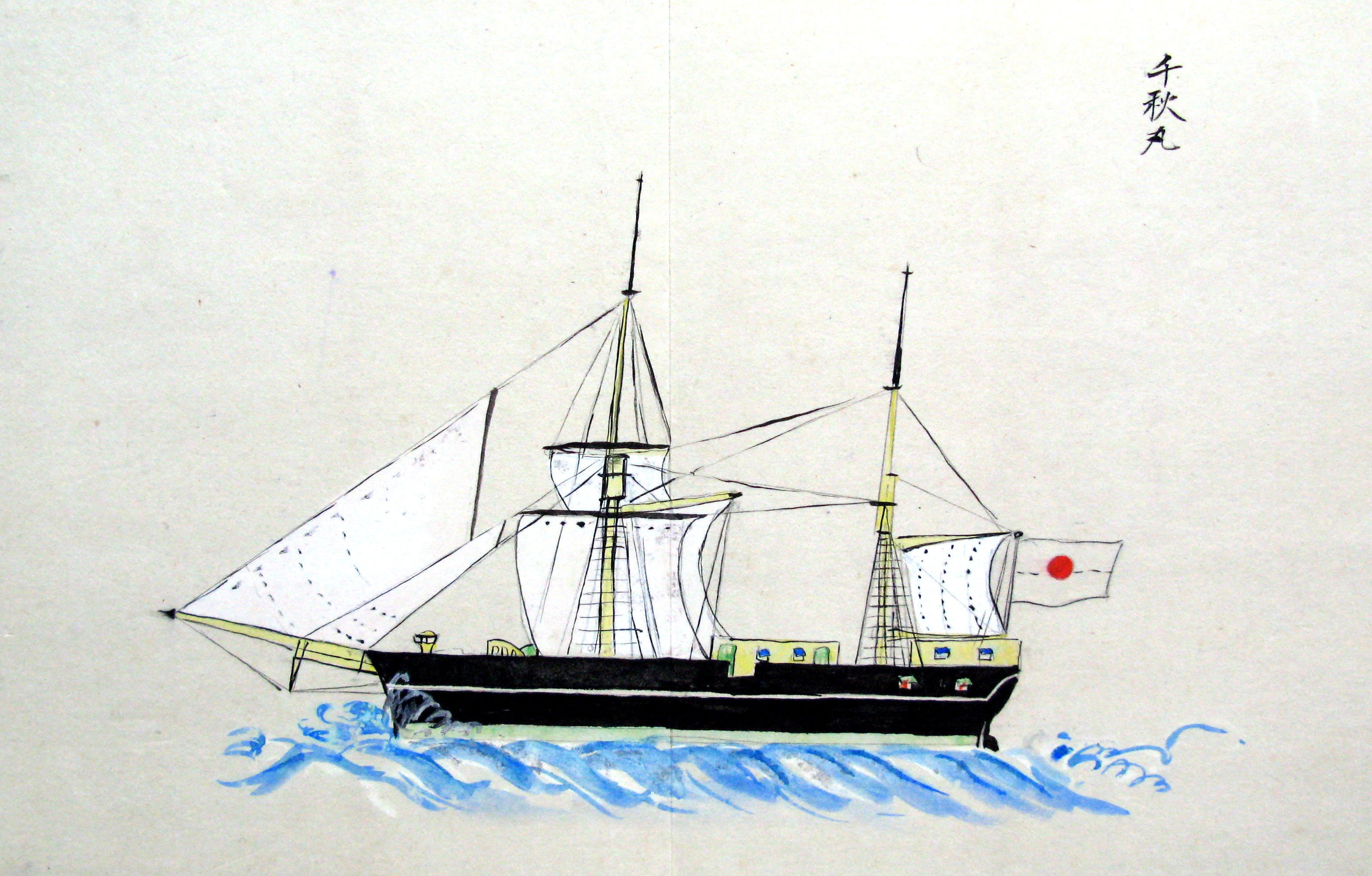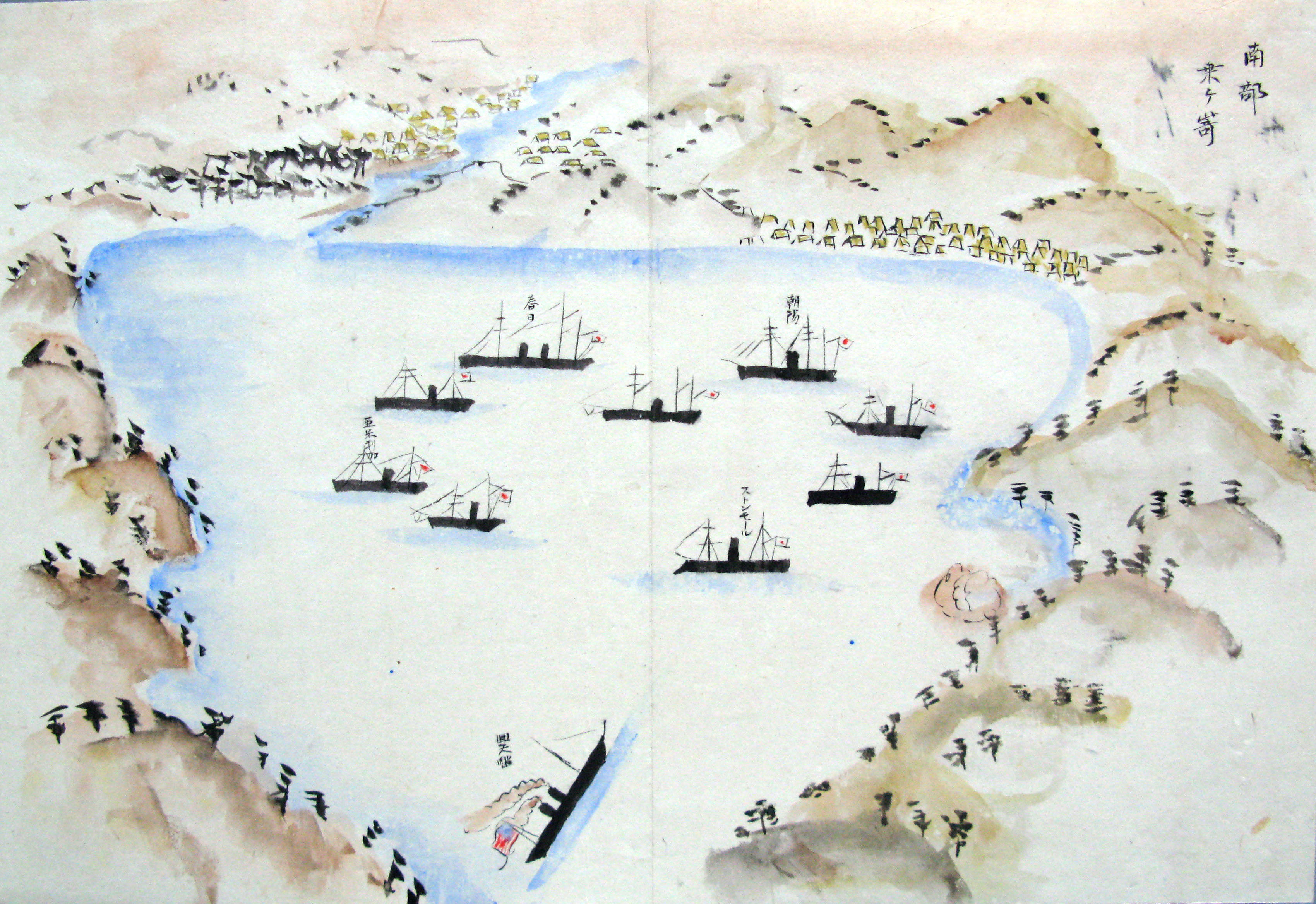 折本(紙本着色) 幕府が所有していた軍艦など37隻が描かれ、後半には箱館港に集結する軍艦・宮古湾での海戦の様子、江差で座礁する開陽などを描いた部分が含まれています。