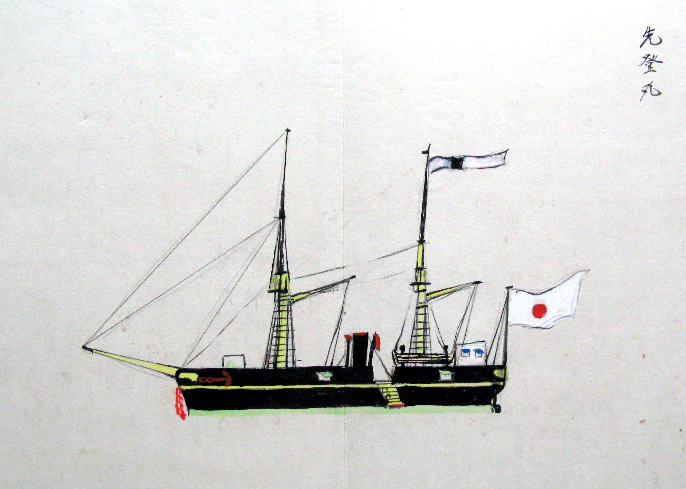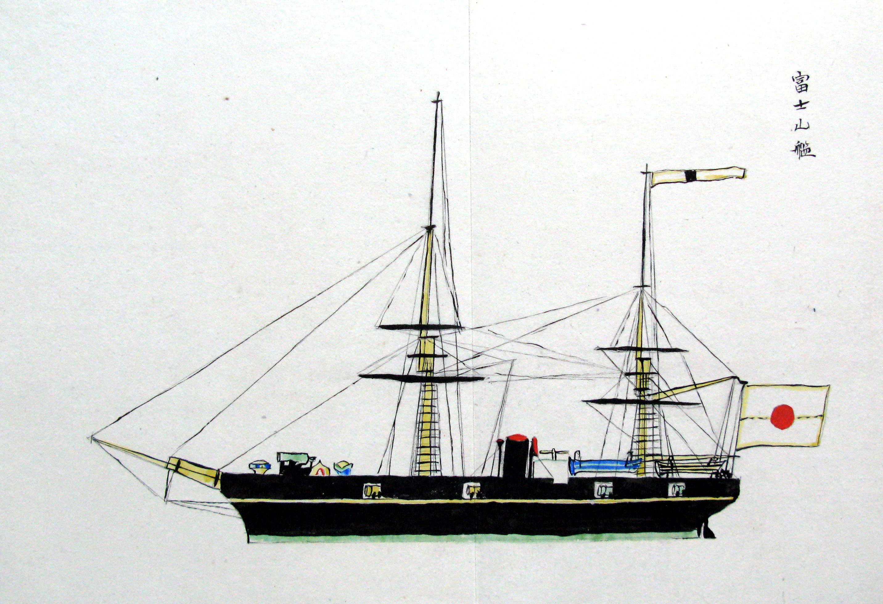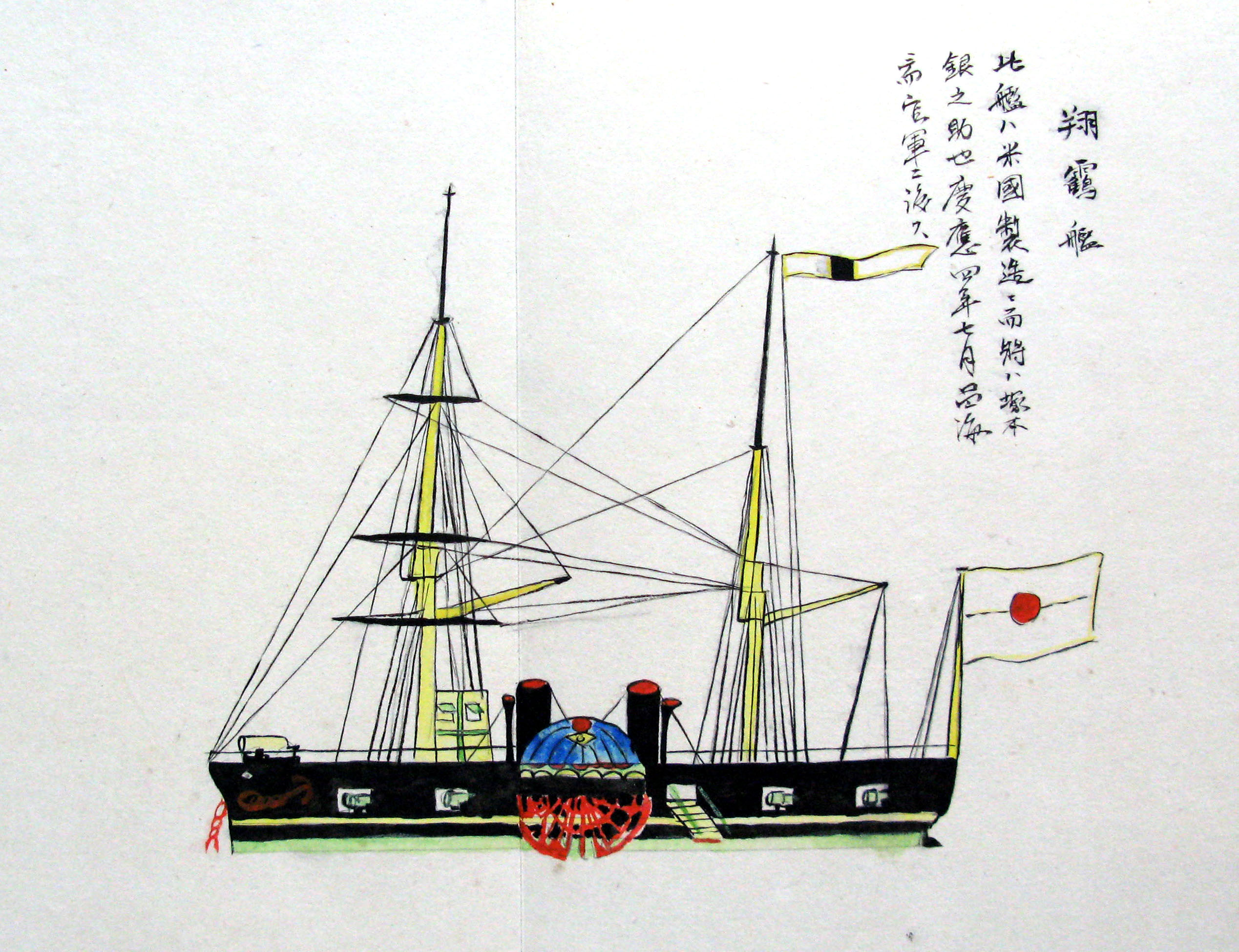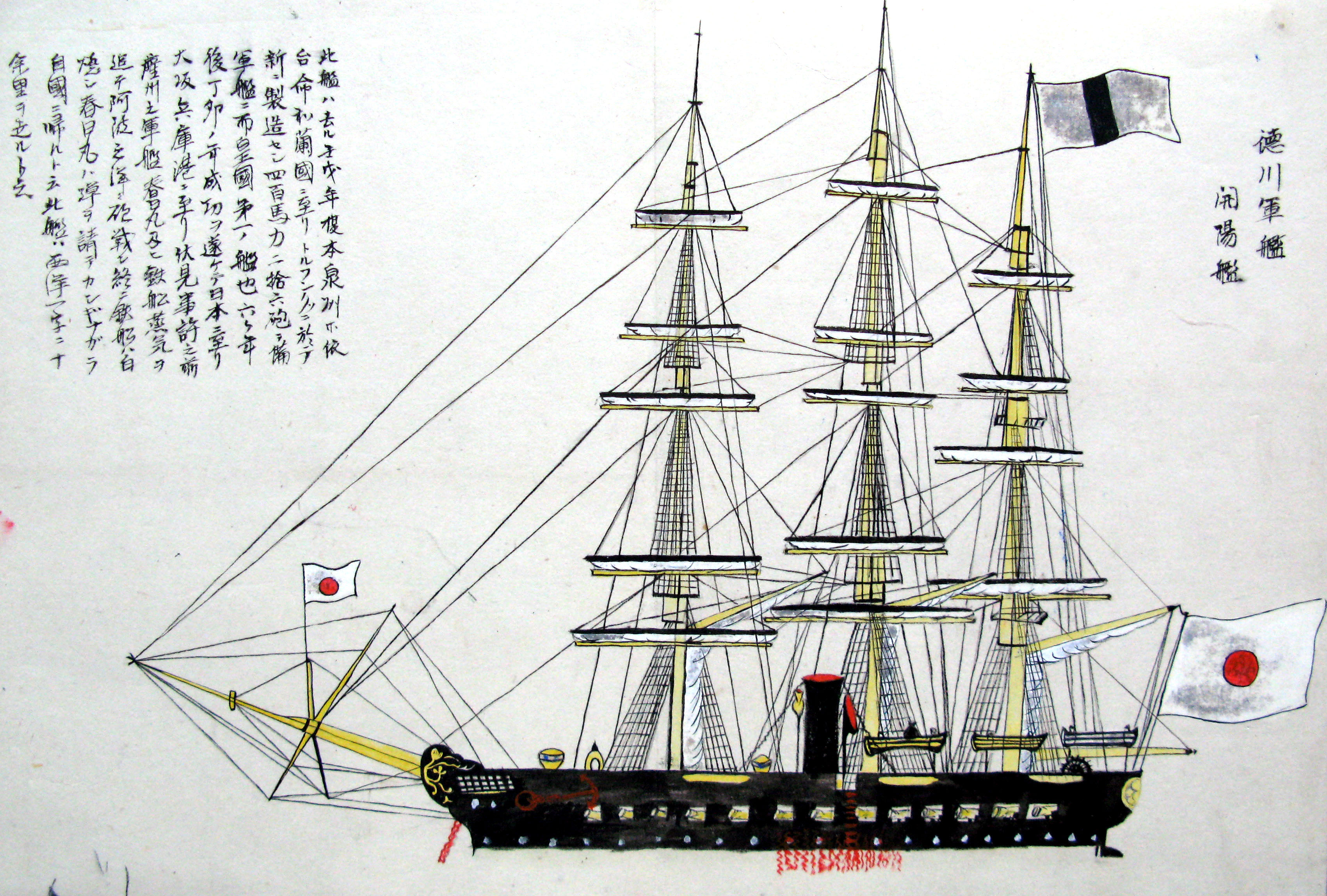 折本(紙本着色) 幕府が所有していた軍艦など37隻が描かれ、後半には箱館港に集結する軍艦・宮古湾での海戦の様子、江差で座礁する開陽などを描いた部分が含まれています。