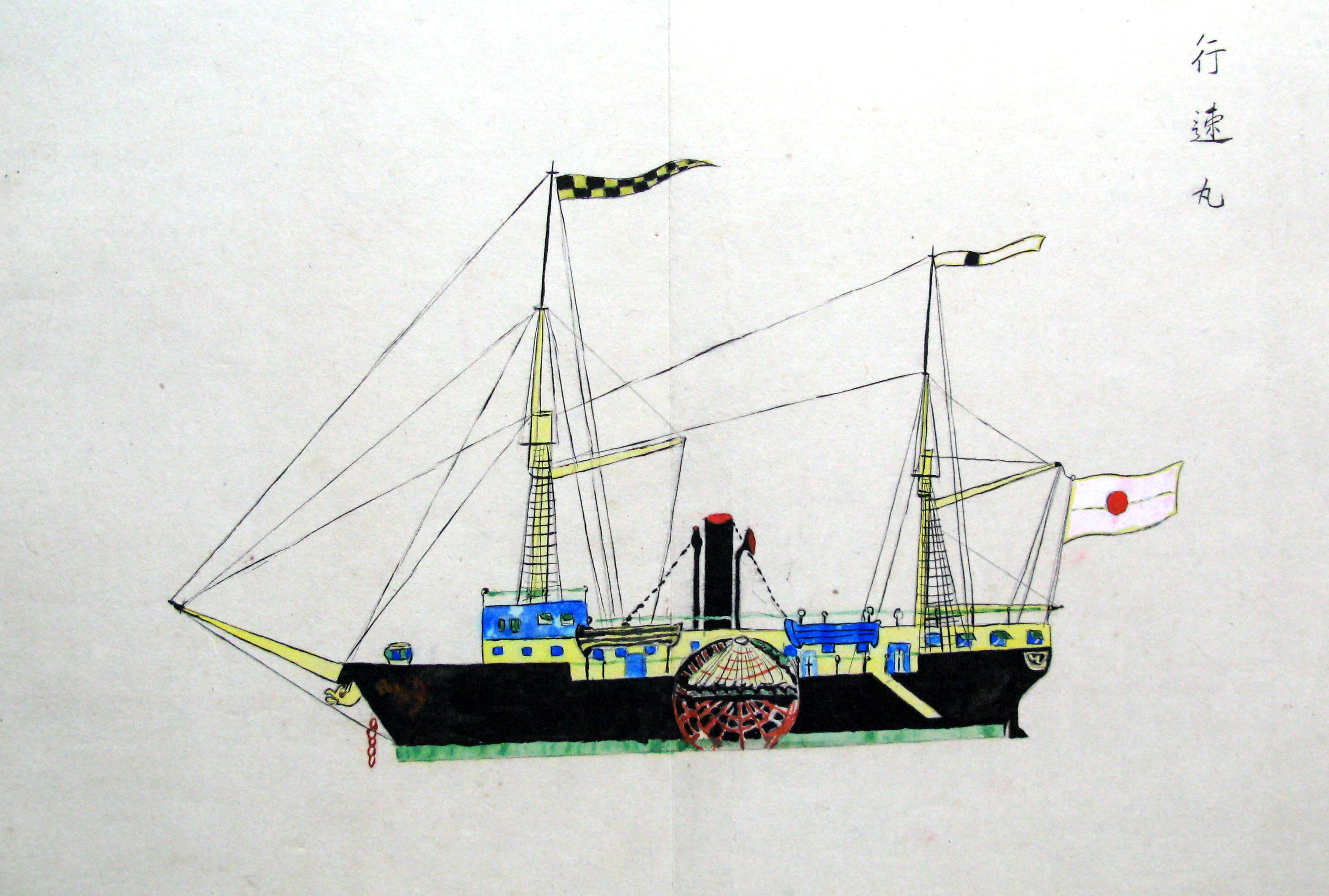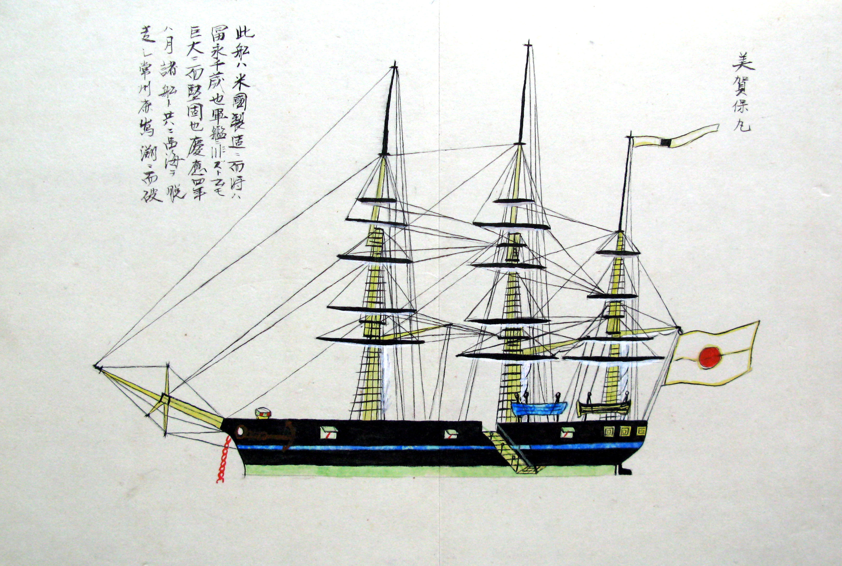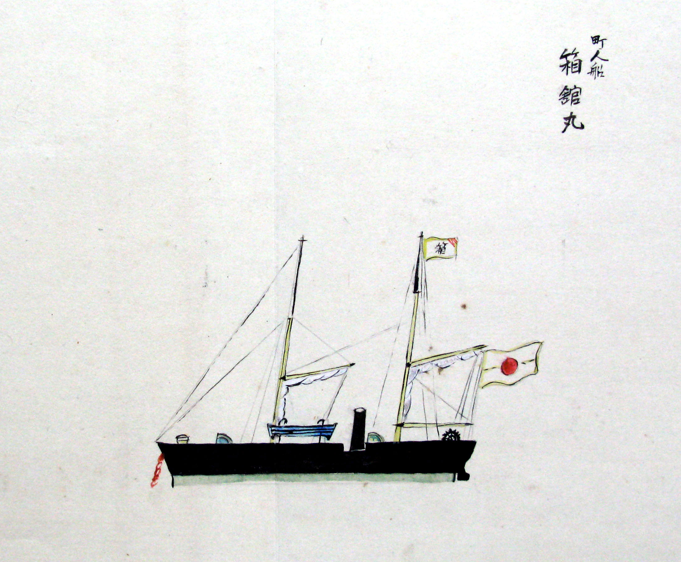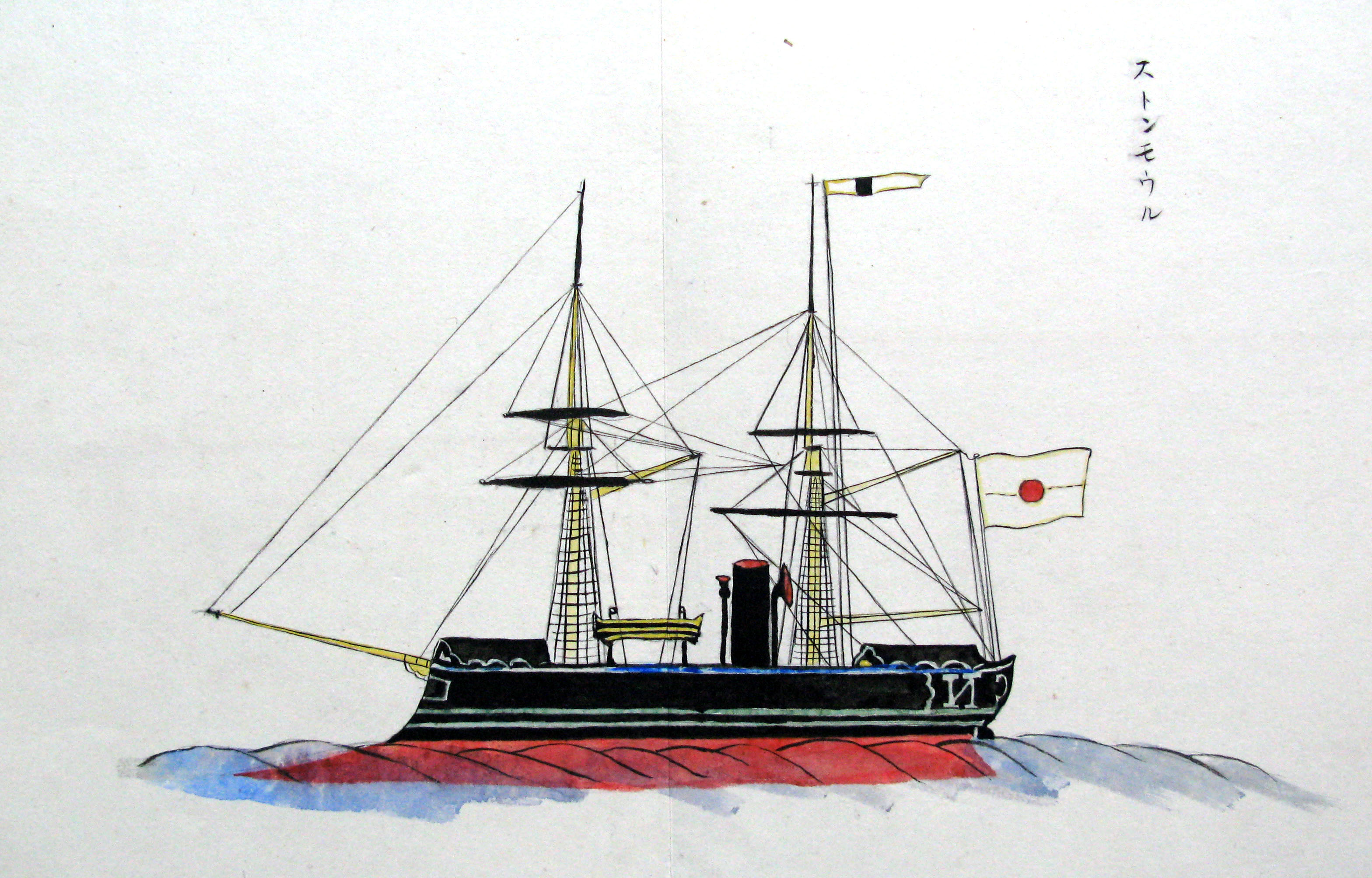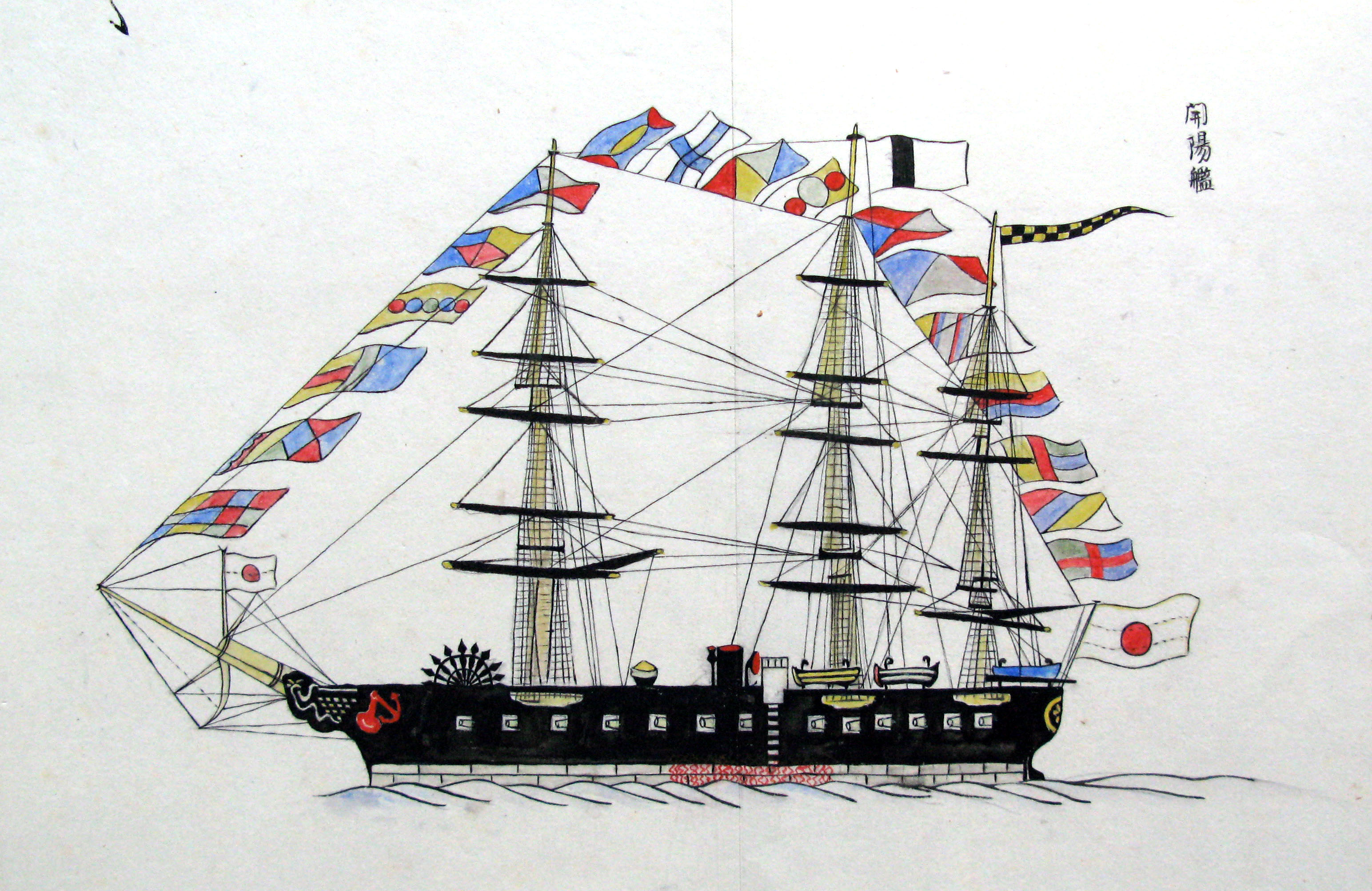 折本(紙本着色) 幕府が所有していた軍艦など37隻が描かれ、後半には箱館港に集結する軍艦・宮古湾での海戦の様子、江差で座礁する開陽などを描いた部分が含まれています。