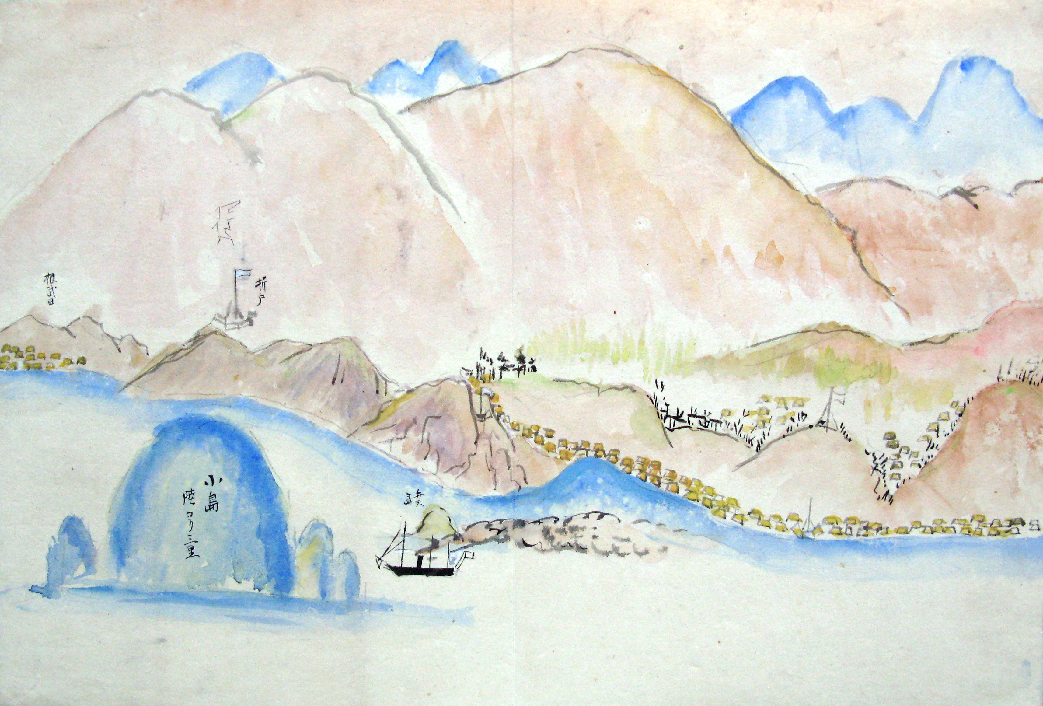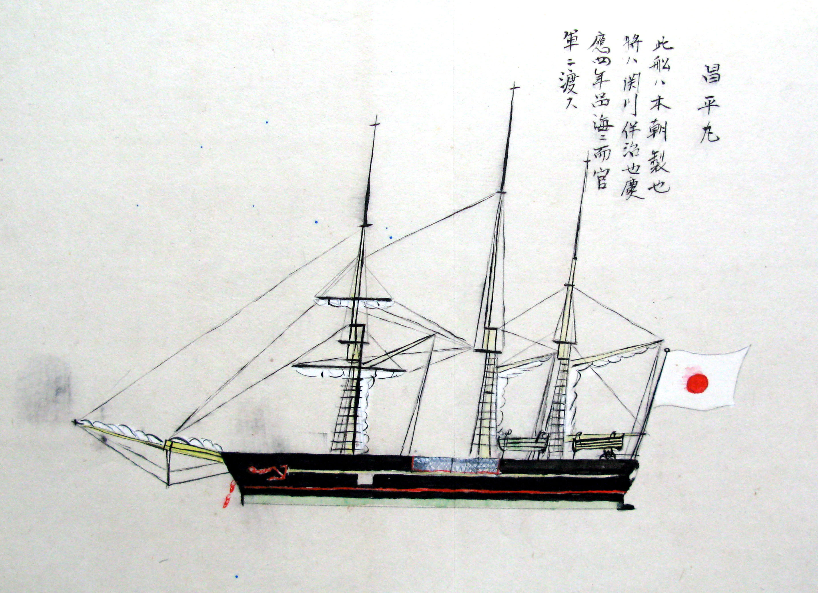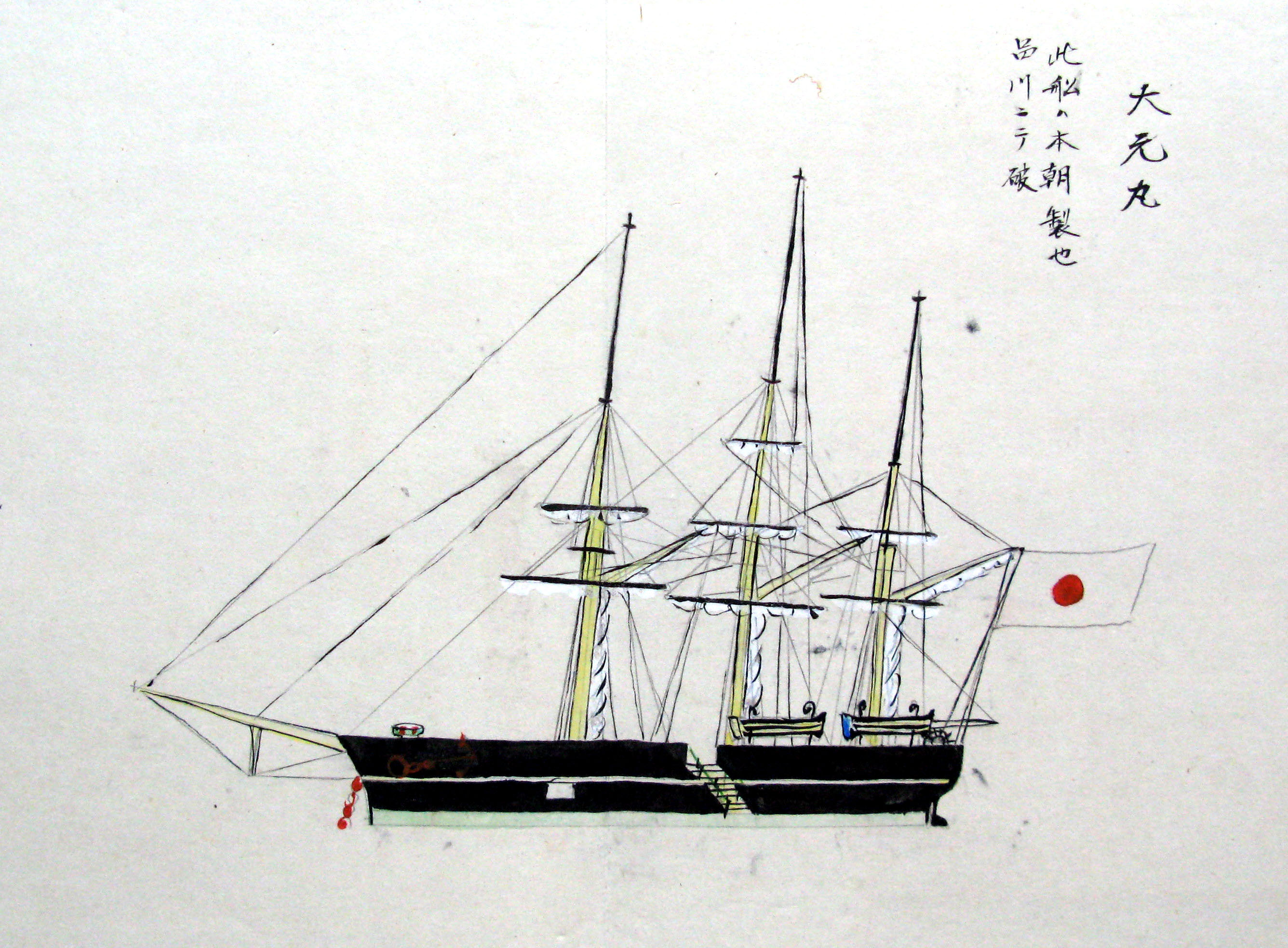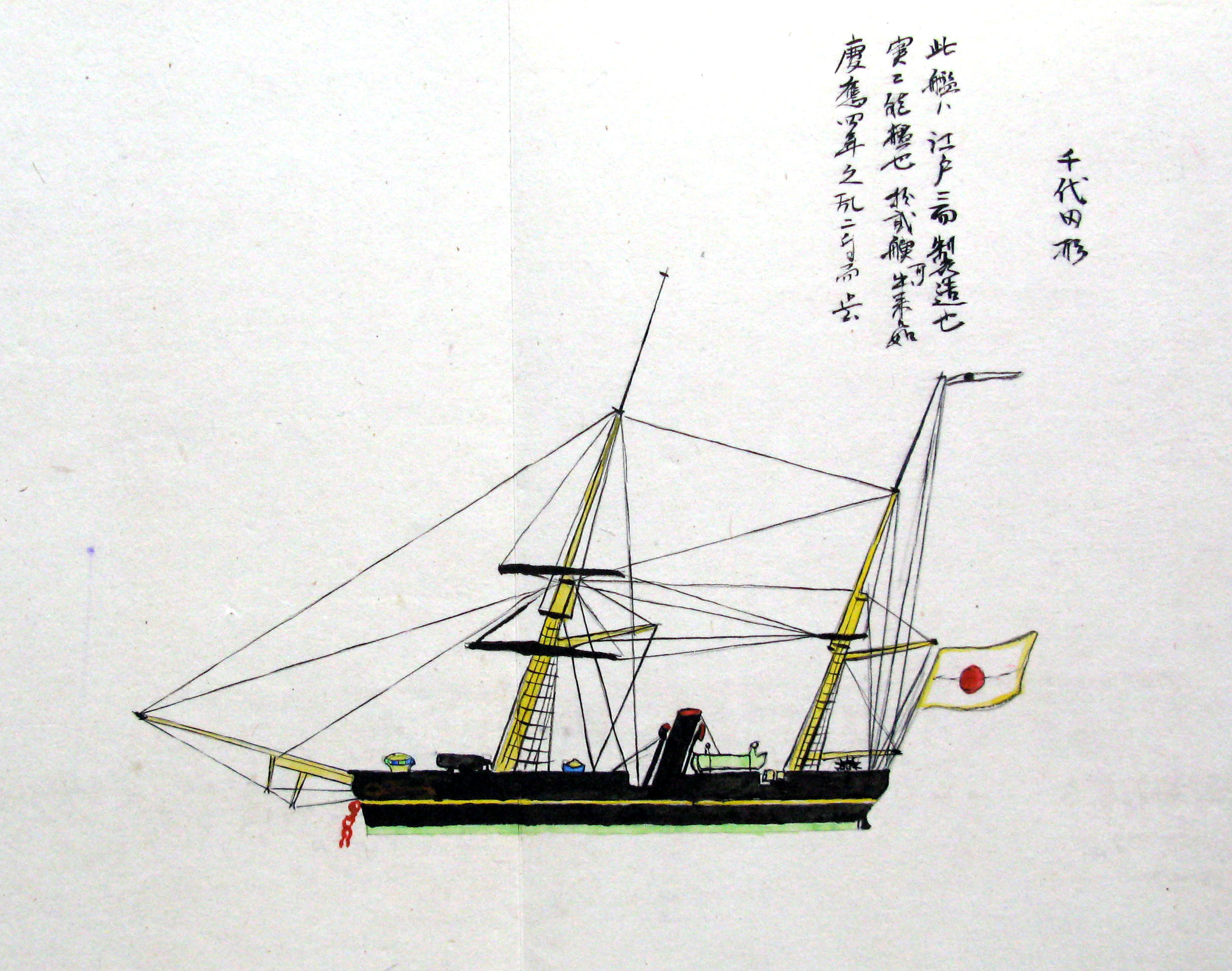 折本(紙本着色) 幕府が所有していた軍艦など37隻が描かれ、後半には箱館港に集結する軍艦・宮古湾での海戦の様子、江差で座礁する開陽などを描いた部分が含まれています。
