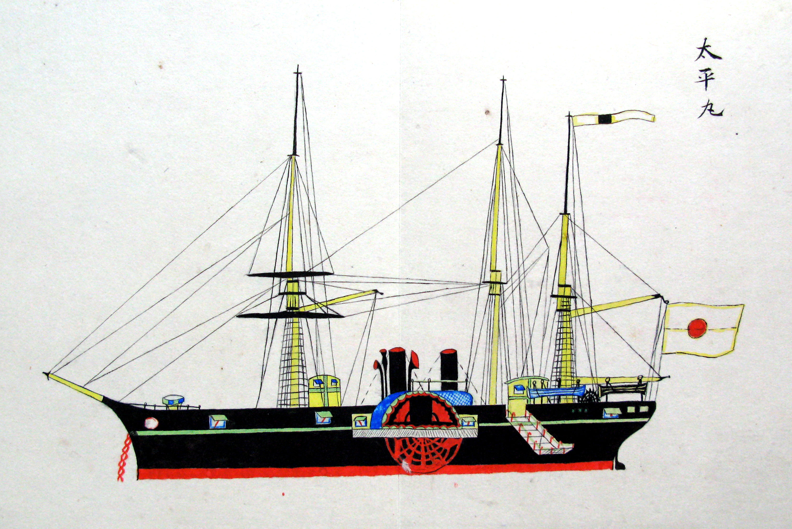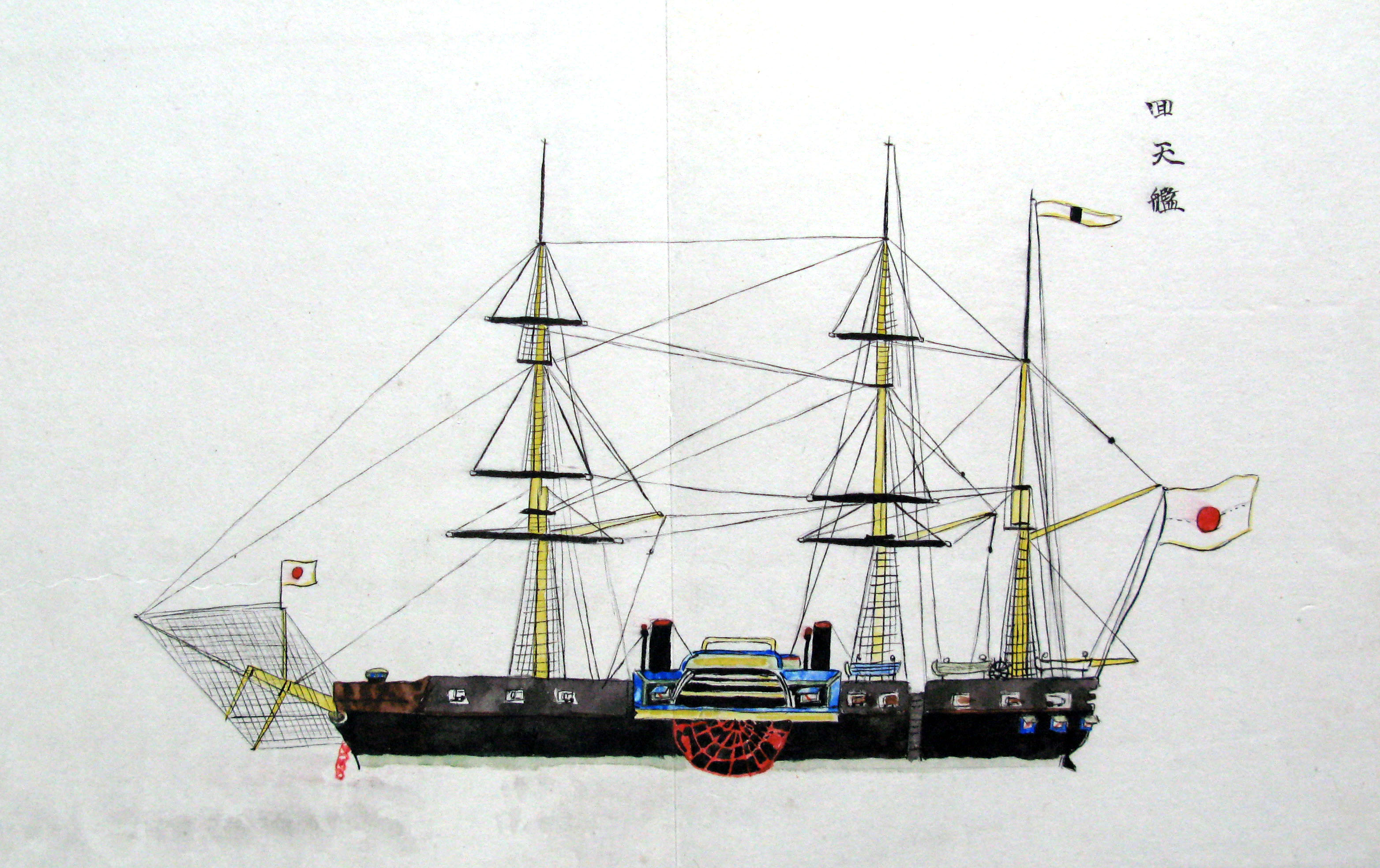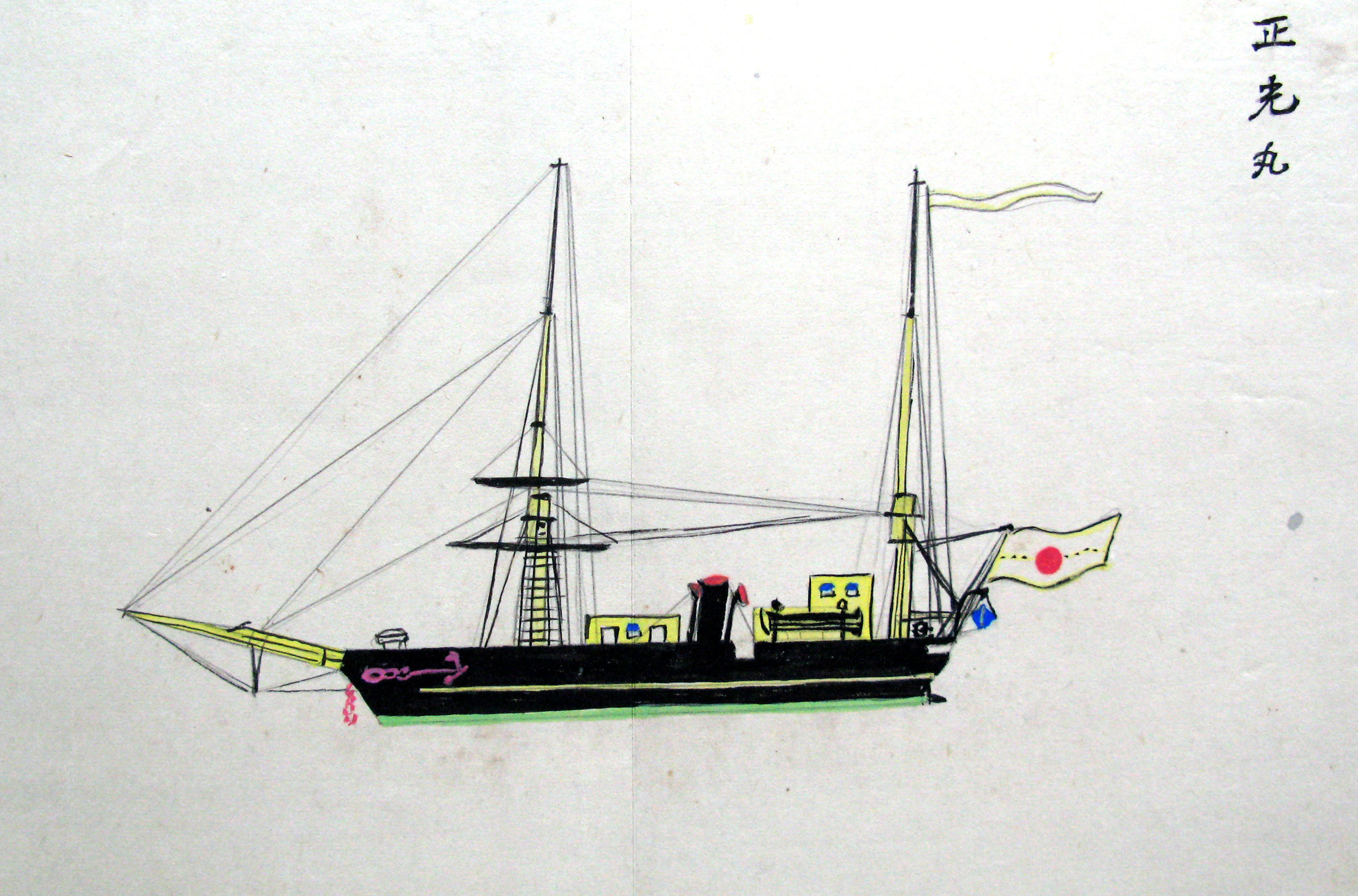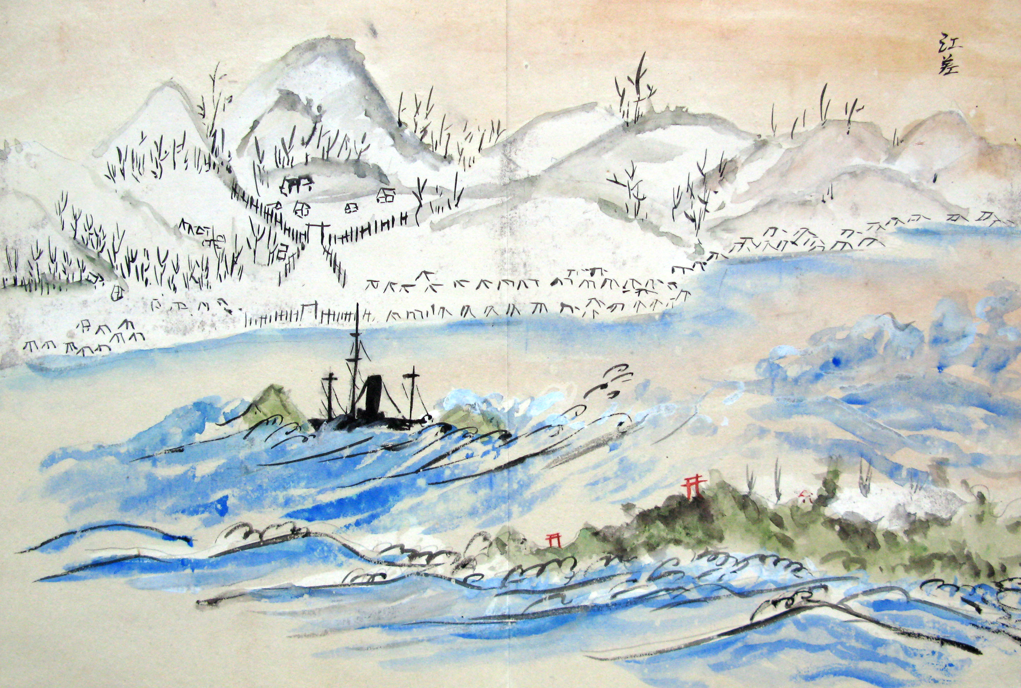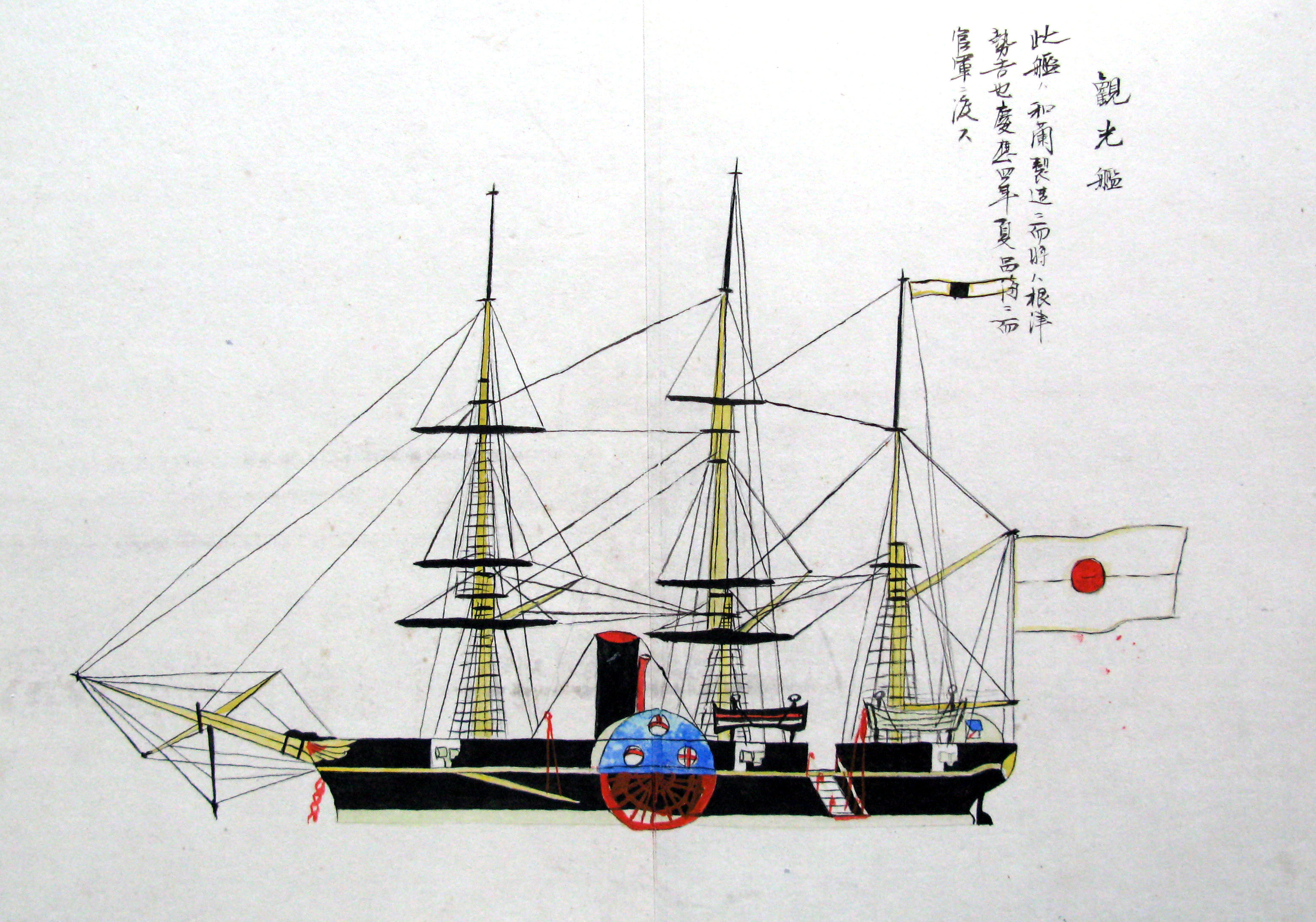 折本(紙本着色) 幕府が所有していた軍艦など37隻が描かれ、後半には箱館港に集結する軍艦・宮古湾での海戦の様子、江差で座礁する開陽などを描いた部分が含まれています。